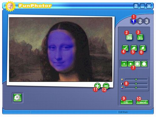 These buttons set the size of the Paint, Blur, and Eraser